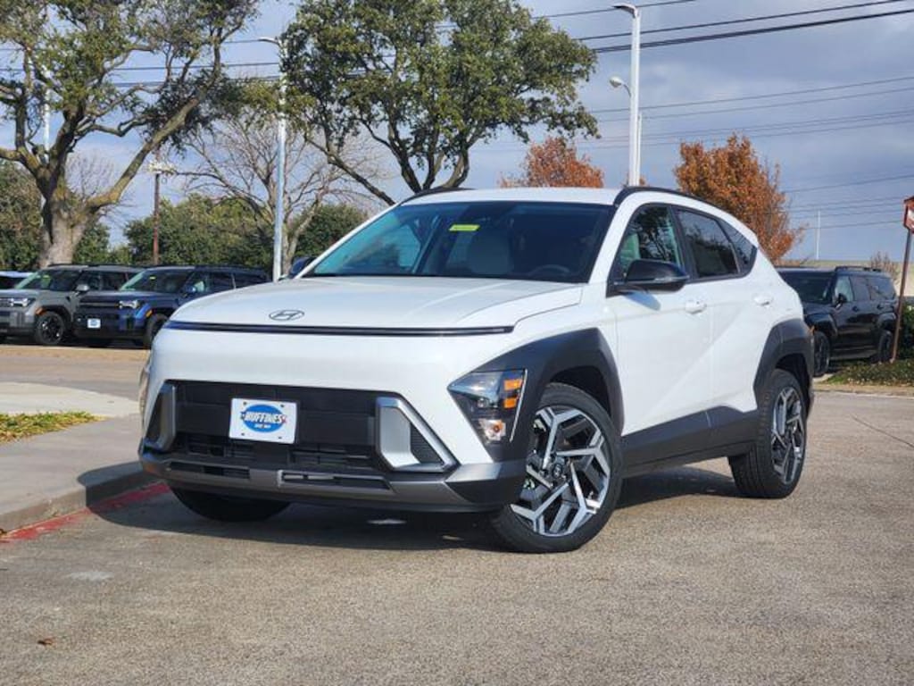 White 2026 Hyundai Kona SEL Premium 4D Sport Utility SEL Premium FWD 8-Speed Automatic I4 Option Group 01, 4-Wheel Disc Brakes, 6 Speakers, ABS brakes, Air Conditioning, All Season Fitted Liners, Alloy wheels, AM/FM radio: SiriusXM, Apple CarPlay & Android Auto, Auto High-beam Headlights, Automatic temperature control, Brake assist, Bumpers: body-color, Cargo Blocks, Cargo Tray, Carpeted Floor Mats, Delay-off headlights, Driver door bin, Driver vanity mirror, Dual front impact airbags, Dual front side impact airbags, Electronic Stability Control, Emergency communication system: None, Exterior Parking Camera Rear, First Aid Kit, Front anti-roll bar, Front Bucket Seats, Front Center Armrest, Front dual zone A/C, Front reading lights, Front wheel independent suspension, Fully automatic headlights, H-Tex Seat Trim, Heated door mirrors, Heated Front Bucket Seats, Heated front seats, Illuminated entry, Leather steering wheel, Low tire pressure warning, Occupant sensing airbag, Outside temperature display, Overhead airbag, Panic alarm, Passenger door bin, Passenger vanity mirror, Power door mirrors, Power driver seat, Power steering, Power windows, Radio: AM/FM/SiriusXM/HD Audio System, Rear seat center armrest, Rear window defroster, Rear window wiper, Remote keyless entry, Security system, Speed control, Speed-sensing steering, Split folding rear seat, Spoiler, Steering wheel mounted audio controls, Tachometer, Telescoping steering wheel, Tilt steering wheel, Traction control, Trip computer, Turn signal indicator mirrors, Variably intermittent wipers, and Wheels: 19" x 7.5J Black/Silver Alloy.