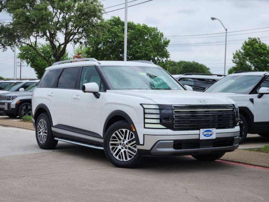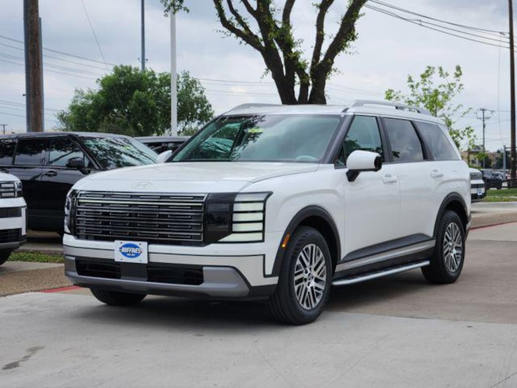 White Pearl 2026 Hyundai Palisade SEL Premium 7 Passenger 4D Sport Utility SEL Premium 7 Passenger FWD 8-Speed Automatic V6 Option Group 01, 100W Charging Cable, 3rd row seats: split-bench, 4-Wheel Disc Brakes, 8 Speakers, ABS brakes, Air Conditioning, Alloy wheels, AM/FM radio: SiriusXM, Apple CarPlay & Android Auto, Audio memory, Auto High-beam Headlights, Auto-dimming door mirrors, Auto-dimming Rear-View mirror, Auto-leveling suspension, Automatic temperature control, Brake assist, Bumpers: body-color, Cargo Tray, Carpeted Floor Mats, Compass, Delay-off headlights, Driver door bin, Driver vanity mirror, Dual front impact airbags, Dual front side impact airbags, Electronic Stability Control, Emergency communication system: None, Exterior Parking Camera Rear, Four wheel independent suspension, Front anti-roll bar, Front Bucket Seats, Front Center Armrest, Front dual zone A/C, Front reading lights, Fully automatic headlights, Garage door transmitter: HomeLink, H-Tex Leatherette Seat Trim, Heated and Ventilated Front Bucket Seats, Heated door mirrors, Heated front seats, Heated rear seats, Heated steering wheel, HVAC memory, Illuminated entry, Knee airbag, Leather steering wheel, Low tire pressure warning, Memory seat, Navigation System, Occupant sensing airbag, Outside temperature display, Overhead airbag, Overhead console, Panic alarm, Passenger door bin, Passenger vanity mirror, Power door mirrors, Power driver seat, Power Liftgate, Power moonroof, Power passenger seat, Power steering, Power windows, Radio data system, Radio: Infotainment Navigation System, Rear air conditioning, Rear anti-roll bar, Rear audio controls, Rear Bumper Applique, Rear reading lights, Rear side impact airbag, Rear window defroster, Rear window wiper, Reclining 3rd row seat, Remote keyless entry, Security system, Side Steps, Speed control, Split folding rear seat, Spoiler, Steering wheel mounted audio controls, Tachometer, Telescoping steering wheel, Tilt steering wheel, Traction control, Trip computer, Turn signal indicator mirrors, Variably intermittent wipers, Ventilated front seats, Ventilated rear seats, and Wheels: 18" x 8.0J Alloy.