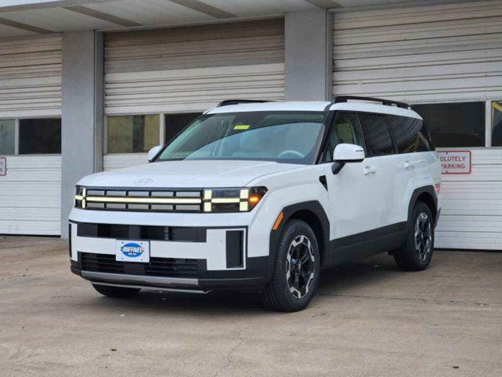 White 2026 Hyundai Santa Fe SEL 4D Sport Utility SEL FWD 8-Speed Automatic with SHIFTRONIC 2.5L I4 Option Group 01, 18" x 7.5J Alloy Wheels, 3rd row seats: bench, 4-Wheel Disc Brakes, 6 Speakers, ABS brakes, Air Conditioning, Alloy wheels, AM/FM radio: SiriusXM, Apple CarPlay & Android Auto, Auto High-beam Headlights, Automatic temperature control, Brake assist, Bumpers: body-color, Cargo Cover/Screen, Cargo Net, Cargo Tray, Carpeted Floor Mats, Delay-off headlights, Driver door bin, Driver vanity mirror, Dual front impact airbags, Dual front side impact airbags, Electronic Stability Control, Emergency communication system, Exterior Parking Camera Rear, First Aid Kit, Four wheel independent suspension, Front anti-roll bar, Front Bucket Seats, Front Center Armrest, Front dual zone A/C, Front reading lights, Fully automatic headlights, H-Tex Leatherette Seat Trim, Heated door mirrors, Heated Front Bucket Seats, Heated front seats, Illuminated entry, Knee airbag, Leather steering wheel, Low tire pressure warning, Occupant sensing airbag, Outside temperature display, Overhead airbag, Overhead console, Panic alarm, Passenger door bin, Passenger vanity mirror, Power door mirrors, Power driver seat, Power Liftgate, Power steering, Power windows, Radio: AM/FM/HD Display Audio, Rear anti-roll bar, Rear seat center armrest, Rear side impact airbag, Rear window defroster, Rear window wiper, Remote keyless entry, Security system, Speed control, Speed-sensing steering, Split folding rear seat, Spoiler, Steering wheel mounted audio controls, Tachometer, Telescoping steering wheel, Tilt steering wheel, Traction control, Trip computer, Turn signal indicator mirrors, and Variably intermittent wipers.