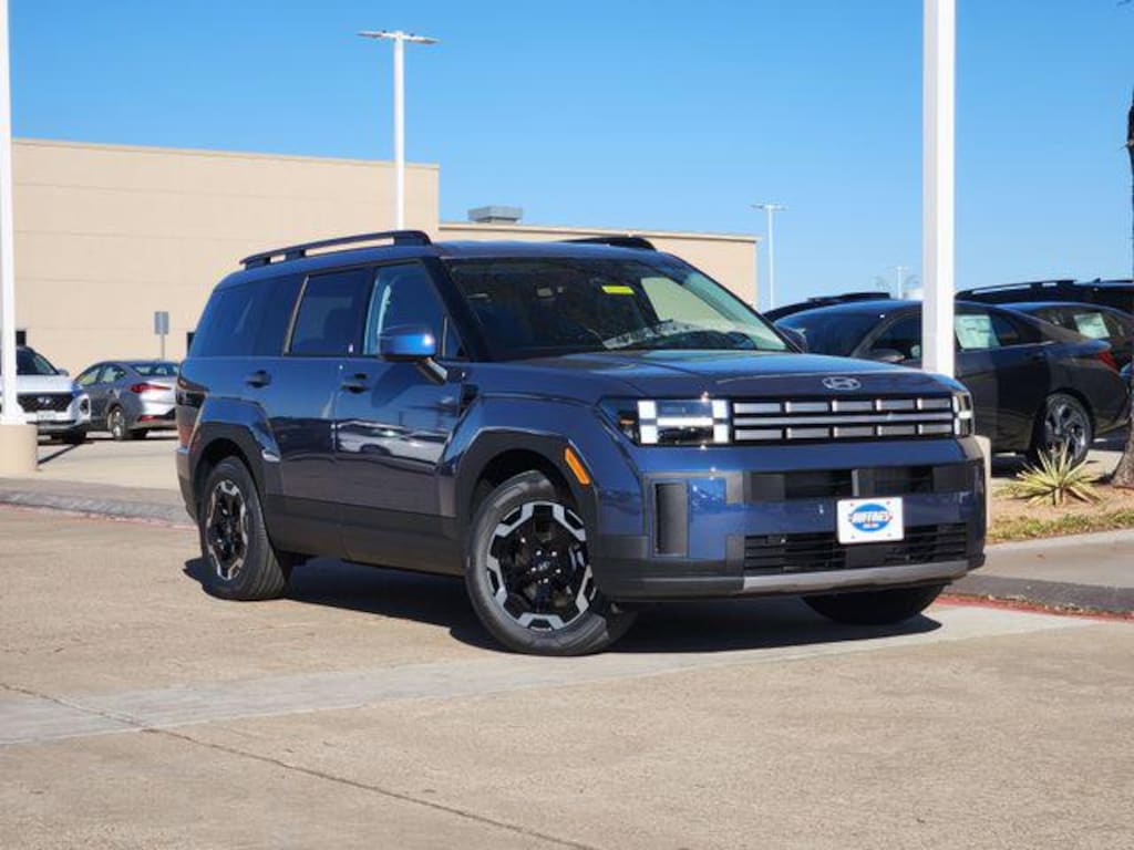 Blue 2026 Hyundai Santa Fe SEL 4D Sport Utility SEL FWD 8-Speed Automatic with SHIFTRONIC 2.5L I4 Option Group 01, 18" x 7.5J Alloy Wheels, 3rd row seats: bench, 4-Wheel Disc Brakes, 6 Speakers, ABS brakes, Air Conditioning, Alloy wheels, AM/FM radio: SiriusXM, Apple CarPlay & Android Auto, Auto High-beam Headlights, Automatic temperature control, Brake assist, Bumpers: body-color, Cargo Cover/Screen, Cargo Net, Cargo Tray, Carpeted Floor Mats, Delay-off headlights, Driver door bin, Driver vanity mirror, Dual front impact airbags, Dual front side impact airbags, Electronic Stability Control, Emergency communication system, Exterior Parking Camera Rear, First Aid Kit, Four wheel independent suspension, Front anti-roll bar, Front Bucket Seats, Front Center Armrest, Front dual zone A/C, Front reading lights, Fully automatic headlights, H-Tex Leatherette Seat Trim, Heated door mirrors, Heated Front Bucket Seats, Heated front seats, Illuminated entry, Knee airbag, Leather steering wheel, Low tire pressure warning, Mudguards, Occupant sensing airbag, Outside temperature display, Overhead airbag, Overhead console, Panic alarm, Passenger door bin, Passenger vanity mirror, Power door mirrors, Power driver seat, Power Liftgate, Power steering, Power windows, Radio: AM/FM/HD Display Audio, Rear anti-roll bar, Rear seat center armrest, Rear side impact airbag, Rear window defroster, Rear window wiper, Remote keyless entry, Security system, Speed control, Speed-sensing steering, Split folding rear seat, Spoiler, Steering wheel mounted audio controls, Tachometer, Telescoping steering wheel, Tilt steering wheel, Traction control, Trip computer, Turn signal indicator mirrors, and Variably intermittent wipers.