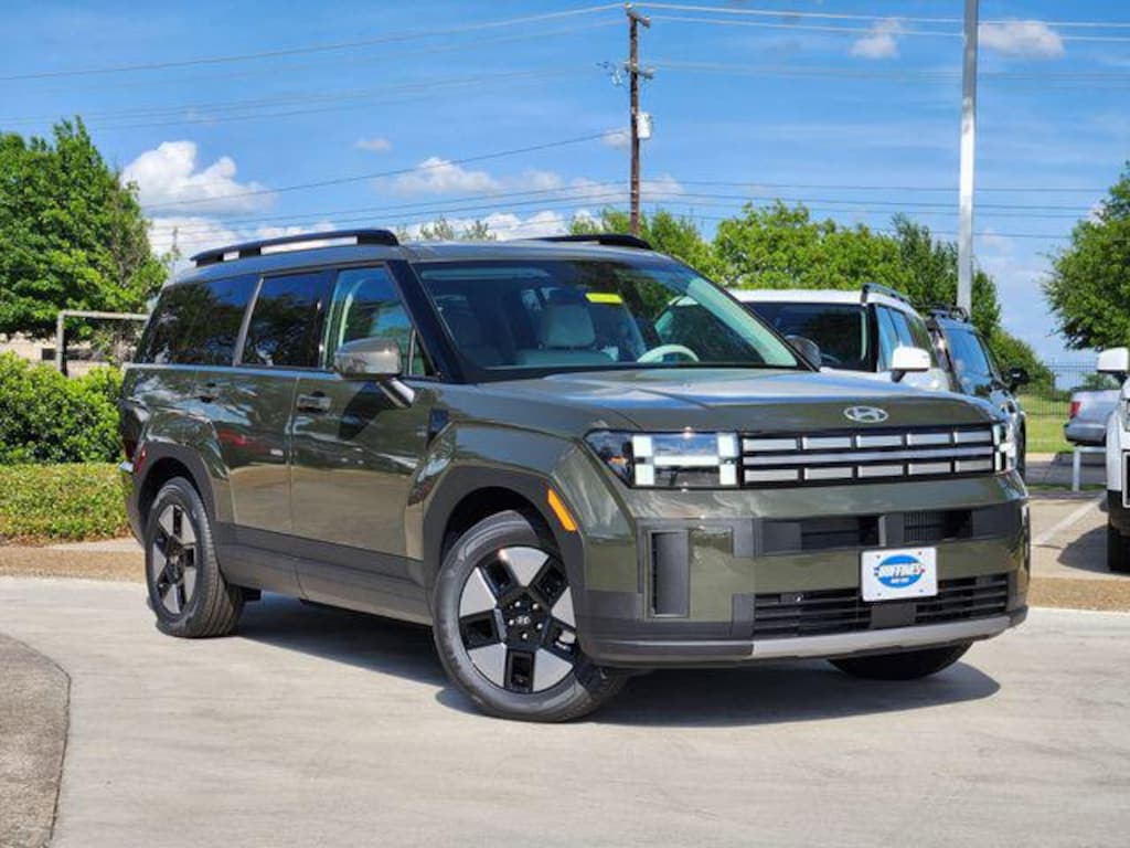 Green 2026 Hyundai Santa Fe Hybrid SEL 4D Sport Utility SEL FWD 6-Speed Automatic with Shiftronic I4 Option Group 01, 18" x 7.5J Alloy Wheels, 3rd row seats: bench, 4-Wheel Disc Brakes, 6 Speakers, ABS brakes, Air Conditioning, Alloy wheels, AM/FM radio: SiriusXM, Apple CarPlay & Android Auto, Auto High-beam Headlights, Automatic temperature control, Brake assist, Bumpers: body-color, Cargo Blocks, Cargo Cover/Screen, Cargo Net, Cargo Organizer, Cargo Tray, Carpeted Floor Mats, Delay-off headlights, Driver door bin, Driver vanity mirror, Dual front impact airbags, Dual front side impact airbags, Electronic Stability Control, Emergency communication system, Exterior Parking Camera Rear, First Aid Kit, Four wheel independent suspension, Front anti-roll bar, Front Bucket Seats, Front Center Armrest, Front dual zone A/C, Front reading lights, Fully automatic headlights, H-Tex Leatherette Seat Trim, Heated door mirrors, Heated Front Bucket Seats, Heated front seats, Illuminated entry, Knee airbag, Leather steering wheel, Low tire pressure warning, Occupant sensing airbag, Outside temperature display, Overhead airbag, Overhead console, Panic alarm, Passenger door bin, Passenger vanity mirror, Power door mirrors, Power driver seat, Power Liftgate, Power steering, Power windows, Radio: AM/FM/HD Display Audio, Rear anti-roll bar, Rear seat center armrest, Rear side impact airbag, Rear window defroster, Rear window wiper, Remote keyless entry, Security system, Speed control, Speed-sensing steering, Split folding rear seat, Spoiler, Steering wheel mounted audio controls, Tachometer, Telescoping steering wheel, Tilt steering wheel, Traction control, Trip computer, Turn signal indicator mirrors, and Variably intermittent wipers.