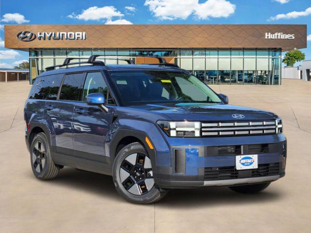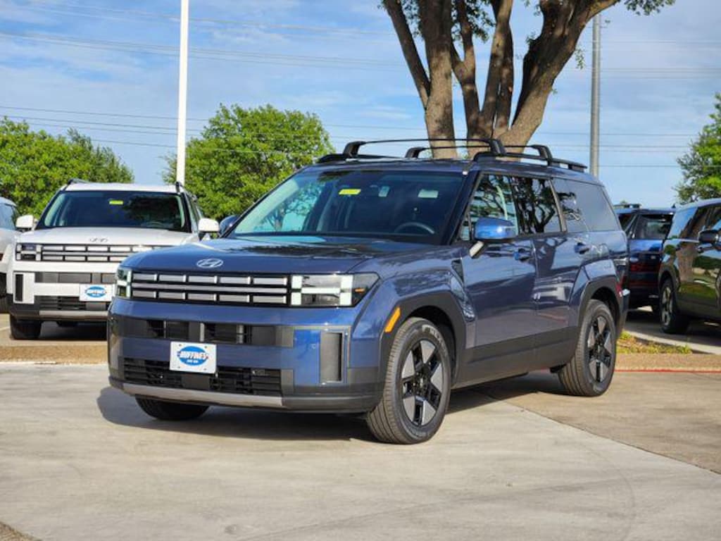 Blue 2026 Hyundai Santa Fe Hybrid SEL 4D Sport Utility SEL FWD 6-Speed Automatic with Shiftronic I4 Option Group 01, 18" x 7.5J Alloy Wheels, 3rd row seats: bench, 4-Wheel Disc Brakes, 6 Speakers, ABS brakes, Air Conditioning, Alloy wheels, AM/FM radio: SiriusXM, Apple CarPlay & Android Auto, Auto High-beam Headlights, Automatic temperature control, Brake assist, Bumpers: body-color, Cargo Cover/Screen, Cargo Net, Carpeted Floor Mats, Delay-off headlights, Driver door bin, Driver vanity mirror, Dual front impact airbags, Dual front side impact airbags, Electronic Stability Control, Emergency communication system, Exterior Parking Camera Rear, Four wheel independent suspension, Front anti-roll bar, Front Bucket Seats, Front Center Armrest, Front dual zone A/C, Front reading lights, Fully automatic headlights, H-Tex Leatherette Seat Trim, Heated door mirrors, Heated Front Bucket Seats, Heated front seats, Illuminated entry, Knee airbag, Leather steering wheel, Low tire pressure warning, Occupant sensing airbag, Outside temperature display, Overhead airbag, Overhead console, Panic alarm, Passenger door bin, Passenger vanity mirror, Power door mirrors, Power driver seat, Power Liftgate, Power steering, Power windows, Radio: AM/FM/HD Display Audio, Rear anti-roll bar, Rear seat center armrest, Rear side impact airbag, Rear window defroster, Rear window wiper, Remote keyless entry, Roof Rack Crossbars, Security system, Speed control, Speed-sensing steering, Split folding rear seat, Spoiler, Steering wheel mounted audio controls, Tachometer, Telescoping steering wheel, Tilt steering wheel, Traction control, Trip computer, Turn signal indicator mirrors, and Variably intermittent wipers.