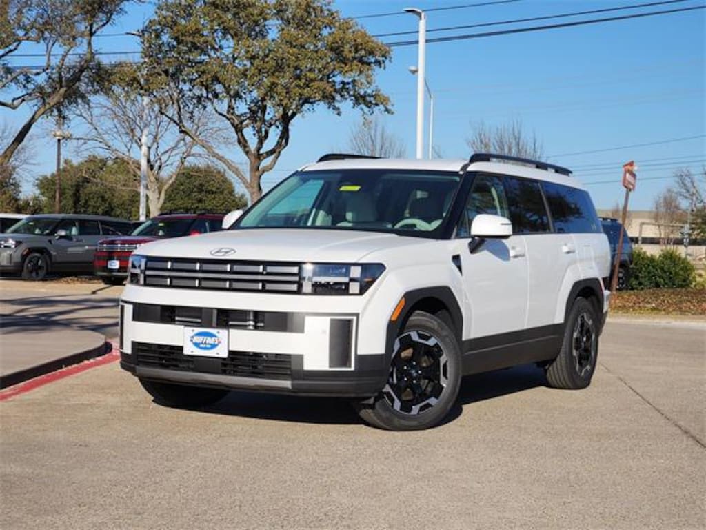 White 2026 Hyundai Santa Fe SEL 4D Sport Utility SEL FWD 8-Speed Automatic with SHIFTRONIC 2.5L I4 Option Group 01, 18" x 7.5J Alloy Wheels, 3rd row seats: bench, 4-Wheel Disc Brakes, 6 Speakers, ABS brakes, Air Conditioning, Alloy wheels, AM/FM radio: SiriusXM, Apple CarPlay & Android Auto, Auto High-beam Headlights, Automatic temperature control, Brake assist, Bumpers: body-color, Cargo Cover/Screen, Cargo Net, Cargo Tray, Carpeted Floor Mats, Delay-off headlights, Driver door bin, Driver vanity mirror, Dual front impact airbags, Dual front side impact airbags, Electronic Stability Control, Emergency communication system, Exterior Parking Camera Rear, First Aid Kit, Four wheel independent suspension, Front anti-roll bar, Front Bucket Seats, Front Center Armrest, Front dual zone A/C, Front reading lights, Fully automatic headlights, H-Tex Leatherette Seat Trim, Heated door mirrors, Heated Front Bucket Seats, Heated front seats, Illuminated entry, Knee airbag, Leather steering wheel, Low tire pressure warning, Mudguards, Occupant sensing airbag, Outside temperature display, Overhead airbag, Overhead console, Panic alarm, Passenger door bin, Passenger vanity mirror, Power door mirrors, Power driver seat, Power Liftgate, Power steering, Power windows, Radio: AM/FM/HD Display Audio, Rear anti-roll bar, Rear seat center armrest, Rear side impact airbag, Rear window defroster, Rear window wiper, Remote keyless entry, Roadside Assistance Kit, Security system, Speed control, Speed-sensing steering, Split folding rear seat, Spoiler, Steering wheel mounted audio controls, Tachometer, Telescoping steering wheel, Tilt steering wheel, Traction control, Trip computer, Turn signal indicator mirrors, and Variably intermittent wipers.