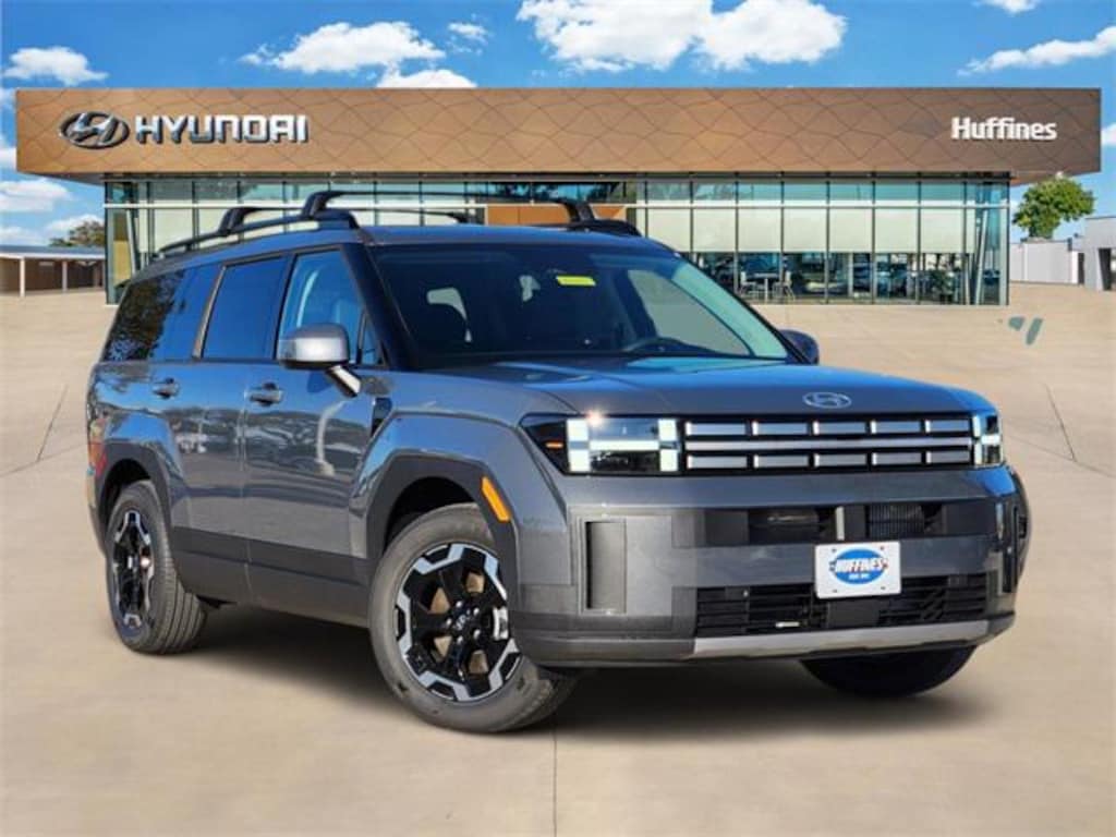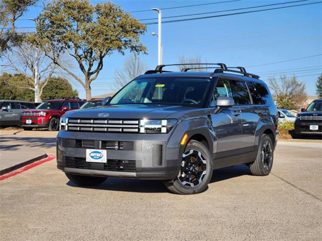 Gray 2026 Hyundai Santa Fe SEL 4D Sport Utility SEL FWD 8-Speed Automatic with SHIFTRONIC 2.5L I4 Option Group 01, 18" x 7.5J Alloy Wheels, 3rd row seats: bench, 4-Wheel Disc Brakes, 6 Speakers, ABS brakes, Air Conditioning, Alloy wheels, AM/FM radio: SiriusXM, Apple CarPlay & Android Auto, Auto High-beam Headlights, Automatic temperature control, Brake assist, Bumpers: body-color, Cargo Net, Cargo Organizer, Cargo Tray, Carpeted Floor Mats, Delay-off headlights, Driver door bin, Driver vanity mirror, Dual front impact airbags, Dual front side impact airbags, Electronic Stability Control, Emergency communication system, Exterior Parking Camera Rear, First Aid Kit, Four wheel independent suspension, Front anti-roll bar, Front Bucket Seats, Front Center Armrest, Front dual zone A/C, Front reading lights, Fully automatic headlights, H-Tex Leatherette Seat Trim, Heated door mirrors, Heated Front Bucket Seats, Heated front seats, Illuminated entry, Knee airbag, Leather steering wheel, Low tire pressure warning, Occupant sensing airbag, Outside temperature display, Overhead airbag, Overhead console, Panic alarm, Passenger door bin, Passenger vanity mirror, Power door mirrors, Power driver seat, Power Liftgate, Power steering, Power windows, Radio: AM/FM/HD Display Audio, Rear anti-roll bar, Rear seat center armrest, Rear side impact airbag, Rear window defroster, Rear window wiper, Remote keyless entry, Roof Rack Crossbars, Security system, Speed control, Speed-sensing steering, Split folding rear seat, Spoiler, Steering wheel mounted audio controls, Tachometer, Telescoping steering wheel, Tilt steering wheel, Traction control, Trip computer, Turn signal indicator mirrors, and Variably intermittent wipers.