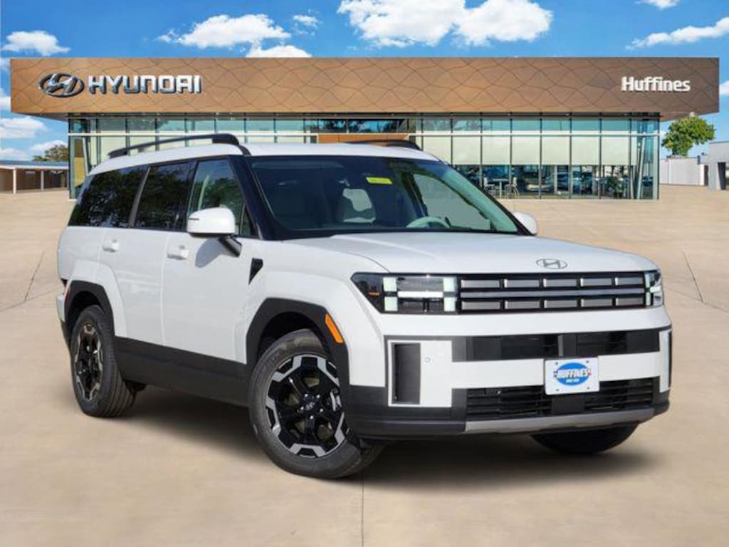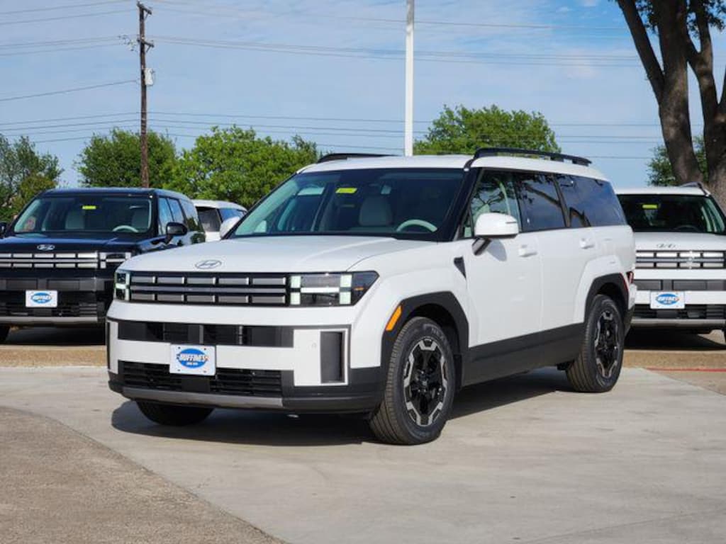 White 2026 Hyundai Santa Fe SEL 4D Sport Utility SEL FWD 8-Speed Automatic with SHIFTRONIC 2.5L I4 Option Group 01, 18" x 7.5J Alloy Wheels, 3rd row seats: bench, 4-Wheel Disc Brakes, 6 Speakers, ABS brakes, Air Conditioning, Alloy wheels, AM/FM radio: SiriusXM, Apple CarPlay & Android Auto, Auto High-beam Headlights, Automatic temperature control, Brake assist, Bumpers: body-color, Cargo Cover/Screen, Cargo Net, Cargo Tray, Carpeted Floor Mats, Delay-off headlights, Driver door bin, Driver vanity mirror, Dual front impact airbags, Dual front side impact airbags, Electronic Stability Control, Emergency communication system, Exterior Parking Camera Rear, First Aid Kit, Four wheel independent suspension, Front anti-roll bar, Front Bucket Seats, Front Center Armrest, Front dual zone A/C, Front reading lights, Fully automatic headlights, H-Tex Leatherette Seat Trim, Heated door mirrors, Heated Front Bucket Seats, Heated front seats, Illuminated entry, Knee airbag, Leather steering wheel, Low tire pressure warning, Mudguards, Occupant sensing airbag, Outside temperature display, Overhead airbag, Overhead console, Panic alarm, Passenger door bin, Passenger vanity mirror, Power door mirrors, Power driver seat, Power Liftgate, Power steering, Power windows, Radio: AM/FM/HD Display Audio, Rear anti-roll bar, Rear seat center armrest, Rear side impact airbag, Rear window defroster, Rear window wiper, Remote keyless entry, Roadside Assistance Kit, Security system, Speed control, Speed-sensing steering, Split folding rear seat, Spoiler, Steering wheel mounted audio controls, Tachometer, Telescoping steering wheel, Tilt steering wheel, Traction control, Trip computer, Turn signal indicator mirrors, and Variably intermittent wipers.