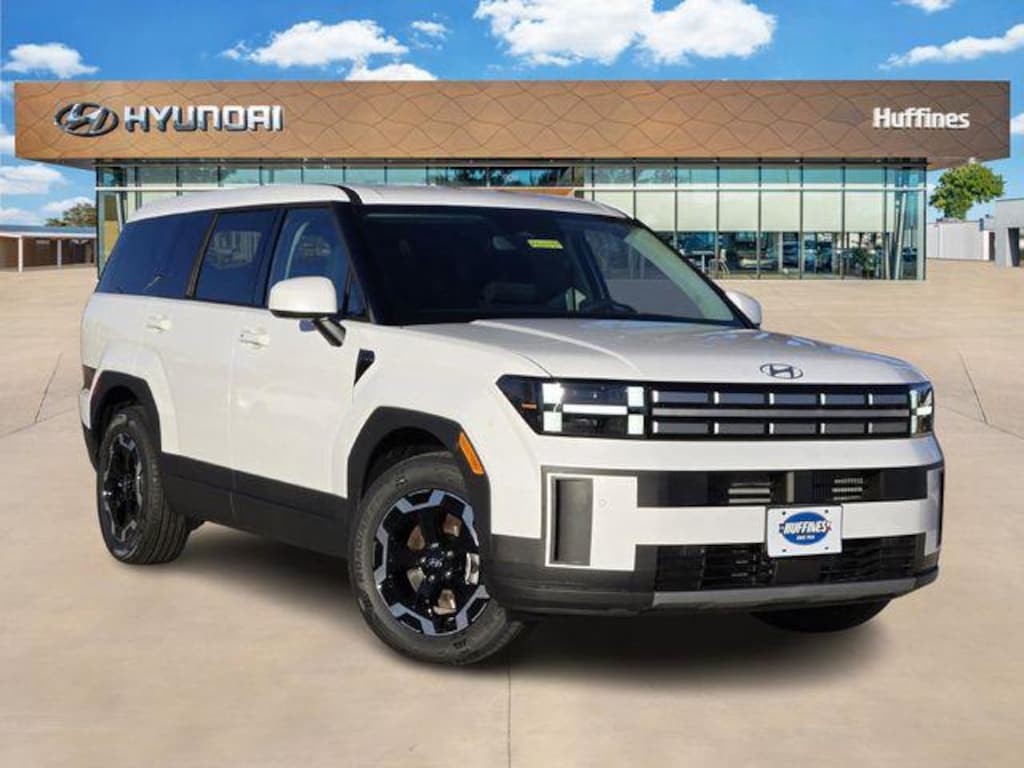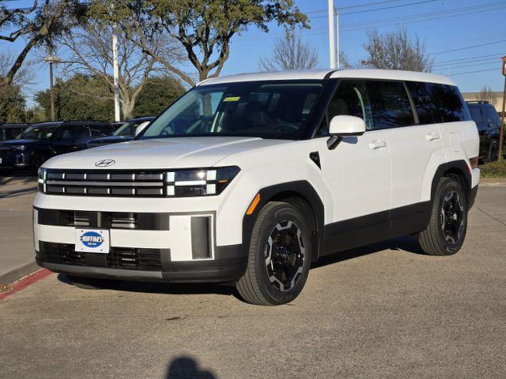 White 2026 Hyundai Santa Fe SE 4D Sport Utility SE FWD 8-Speed Automatic with SHIFTRONIC 2.5L I4 Option Group 01, 18" x 7.5J Alloy Wheels, 3rd row seats: bench, 4-Wheel Disc Brakes, 6 Speakers, ABS brakes, Air Conditioning, Alloy wheels, AM/FM radio: SiriusXM, Apple CarPlay & Android Auto, Auto High-beam Headlights, Brake assist, Bumpers: body-color, Cargo Blocks, Cargo Cover/Screen, Cargo Net, Cargo Organizer, Cargo Tray, Carpeted Floor Mats, Delay-off headlights, Driver door bin, Driver vanity mirror, Dual front impact airbags, Dual front side impact airbags, Electronic Stability Control, Emergency communication system, Exterior Parking Camera Rear, First Aid Kit, Four wheel independent suspension, Front anti-roll bar, Front Bucket Seats, Front Center Armrest, Front reading lights, Fully automatic headlights, Heated door mirrors, Illuminated entry, Knee airbag, Leather steering wheel, Low tire pressure warning, Mudguards, Occupant sensing airbag, Outside temperature display, Overhead airbag, Overhead console, Panic alarm, Passenger door bin, Passenger vanity mirror, Power door mirrors, Power Liftgate, Power steering, Power windows, Radio: AM/FM/HD Display Audio, Rear anti-roll bar, Rear seat center armrest, Rear side impact airbag, Rear window defroster, Rear window wiper, Remote keyless entry, Security system, Speed control, Speed-sensing steering, Split folding rear seat, Spoiler, Steering wheel mounted audio controls, Tachometer, Telescoping steering wheel, Tilt steering wheel, Traction control, Trip computer, Variably intermittent wipers, and YES Essentials Stain-Resistant Cloth Seat Trim.