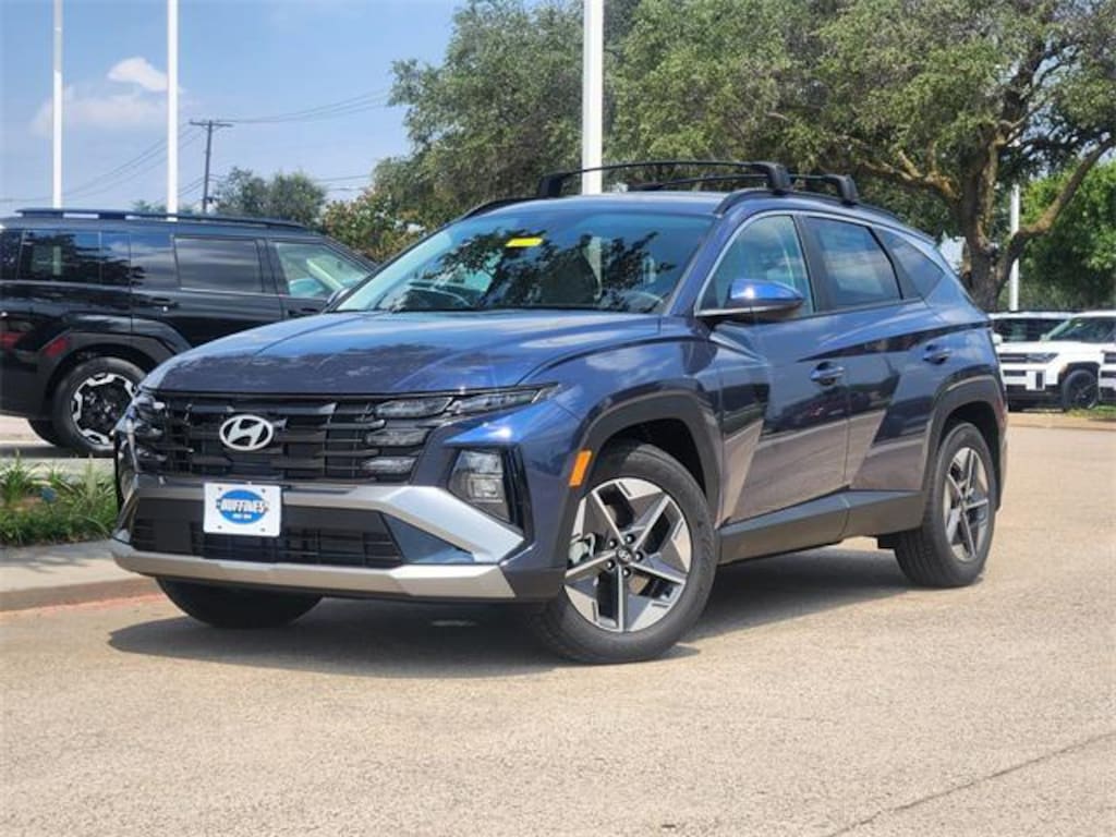 Blue 2026 Hyundai Tucson SEL 4D Sport Utility SEL FWD 8-Speed Automatic with SHIFTRONIC 2.5L I4 DGI DOHC 16V LEV3-SULEV30 187hp Option Group 01, 18" x 7.5J Alloy Wheels, 4-Wheel Disc Brakes, 6 Speakers, ABS brakes, Air Conditioning, Alloy wheels, AM/FM radio: SiriusXM, Apple CarPlay & Android Auto, Auto High-beam Headlights, Automatic temperature control, Brake assist, Bumpers: body-color, Cargo Cover, Cargo Net, Cargo Tray, Carpeted Floor Mats, Delay-off headlights, Driver door bin, Driver vanity mirror, Dual front impact airbags, Dual front side impact airbags, Electronic Stability Control, Emergency communication system: Bluelink+, First Aid Kit, Four wheel independent suspension, Front and Rear Mudguards, Front anti-roll bar, Front Bucket Seats, Front Center Armrest, Front dual zone A/C, Front reading lights, Fully automatic headlights, H-Tex Leatherette Seat Trim, Heated door mirrors, Heated Front Bucket Seats, Heated front seats, Illuminated entry, Low tire pressure warning, Occupant sensing airbag, Outside temperature display, Overhead airbag, Overhead console, Panic alarm, Passenger door bin, Passenger vanity mirror, Power door mirrors, Power driver seat, Power Liftgate, Power steering, Power windows, Radio data system, Radio: AM/FM/HD Audio System, Rear anti-roll bar, Rear reading lights, Rear seat center armrest, Rear side impact airbag, Rear window defroster, Rear window wiper, Remote keyless entry, Roadside Assistance Kit, Roof Rack Cross Rails, Security system, Speed control, Split folding rear seat, Spoiler, Steering wheel mounted audio controls, Tachometer, Telescoping steering wheel, Tilt steering wheel, Traction control, Trip computer, and Variably intermittent wipers.