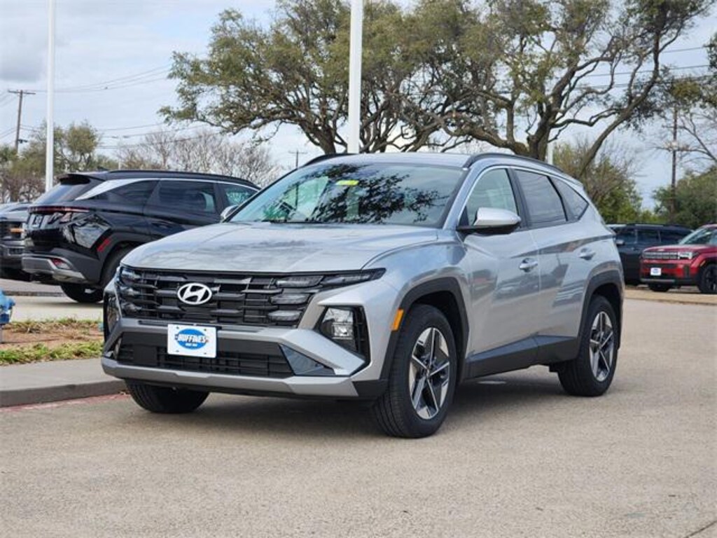 Shimmering Silver 2026 Hyundai Tucson SEL 4D Sport Utility SEL FWD 8-Speed Automatic with SHIFTRONIC 2.5L I4 DGI DOHC 16V LEV3-SULEV30 187hp Option Group 01, 18" x 7.5J Alloy Wheels, 4-Wheel Disc Brakes, 6 Speakers, ABS brakes, Air Conditioning, Alloy wheels, AM/FM radio: SiriusXM, Apple CarPlay & Android Auto, Auto High-beam Headlights, Automatic temperature control, Brake assist, Bumpers: body-color, Cargo Net, Cargo Tray, Carpeted Floor Mats, Cloth Seat Trim, Delay-off headlights, Driver door bin, Driver vanity mirror, Dual front impact airbags, Dual front side impact airbags, Electronic Stability Control, Emergency communication system: None, First Aid Kit, Four wheel independent suspension, Front anti-roll bar, Front Bucket Seats, Front Center Armrest, Front dual zone A/C, Front reading lights, Fully automatic headlights, Heated door mirrors, Heated Front Bucket Seats, Heated front seats, Illuminated entry, Low tire pressure warning, Mudguards, Occupant sensing airbag, Outside temperature display, Overhead airbag, Overhead console, Panic alarm, Passenger door bin, Passenger vanity mirror, Power door mirrors, Power driver seat, Power Liftgate, Power steering, Power windows, Radio data system, Radio: AM/FM/HD Audio System, Rear anti-roll bar, Rear reading lights, Rear seat center armrest, Rear side impact airbag, Rear window defroster, Rear window wiper, Remote keyless entry, Roadside Assistance Kit, Security system, Speed control, Split folding rear seat, Spoiler, Steering wheel mounted audio controls, Tachometer, Telescoping steering wheel, Tilt steering wheel, Traction control, Trip computer, and Variably intermittent wipers.