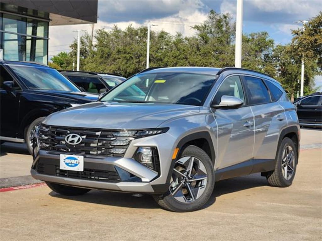 Shimmering Silver 2026 Hyundai Tucson SEL 4D Sport Utility SEL FWD 8-Speed Automatic with SHIFTRONIC 2.5L I4 DGI DOHC 16V LEV3-SULEV30 187hp Option Group 01, 18" x 7.5J Alloy Wheels, 4-Wheel Disc Brakes, 6 Speakers, ABS brakes, Air Conditioning, All Season Fitted Liners, Alloy wheels, AM/FM radio: SiriusXM, Apple CarPlay & Android Auto, Auto High-beam Headlights, Automatic temperature control, Brake assist, Bumpers: body-color, Cargo Blocks, Cargo Cover, Cargo Net, Cargo Tray, Carpeted Floor Mats, Delay-off headlights, Driver door bin, Driver vanity mirror, Dual front impact airbags, Dual front side impact airbags, Electronic Stability Control, Emergency communication system: Bluelink+, First Aid Kit, Four wheel independent suspension, Front and Rear Mudguards, Front anti-roll bar, Front Bucket Seats, Front Center Armrest, Front dual zone A/C, Front reading lights, Fully automatic headlights, H-Tex Leatherette Seat Trim, Heated door mirrors, Heated Front Bucket Seats, Heated front seats, Illuminated entry, Low tire pressure warning, Occupant sensing airbag, Outside temperature display, Overhead airbag, Overhead console, Panic alarm, Passenger door bin, Passenger vanity mirror, Power door mirrors, Power driver seat, Power Liftgate, Power steering, Power windows, Radio data system, Radio: AM/FM/HD Audio System, Rear anti-roll bar, Rear reading lights, Rear seat center armrest, Rear side impact airbag, Rear window defroster, Rear window wiper, Remote keyless entry, Security system, Speed control, Split folding rear seat, Spoiler, Steering wheel mounted audio controls, Tachometer, Telescoping steering wheel, Tilt steering wheel, Traction control, Trip computer, and Variably intermittent wipers.