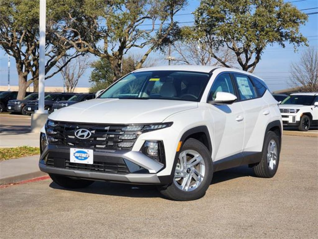 White Pearl 2026 Hyundai Tucson SE 4D Sport Utility SE FWD 8-Speed Automatic with SHIFTRONIC 2.5L I4 DGI DOHC 16V LEV3-SULEV30 187hp Option Group 01, 17" x 7.0J Alloy Wheels, 4-Wheel Disc Brakes, 6 Speakers, ABS brakes, Air Conditioning, All Season Fitted Liners, Alloy wheels, AM/FM radio: SiriusXM, Apple CarPlay & Android Auto, Auto High-beam Headlights, Brake assist, Bumpers: body-color, Cargo Net, Carpeted Floor Mats, Delay-off headlights, Driver door bin, Driver vanity mirror, Dual front impact airbags, Dual front side impact airbags, Electronic Stability Control, Emergency communication system: Bluelink+, First Aid Kit, Four wheel independent suspension, Front anti-roll bar, Front Bucket Seats, Front Center Armrest, Front reading lights, Fully automatic headlights, Illuminated entry, Low tire pressure warning, Occupant sensing airbag, Outside temperature display, Overhead airbag, Overhead console, Panic alarm, Passenger door bin, Passenger vanity mirror, Power door mirrors, Power steering, Power windows, Radio data system, Radio: AM/FM/HD Audio System, Rear anti-roll bar, Rear reading lights, Rear seat center armrest, Rear side impact airbag, Rear window defroster, Rear window wiper, Remote keyless entry, Security system, Speed control, Split folding rear seat, Spoiler, Stain & Odor Resistant Cloth Seat Trim, Steering wheel mounted audio controls, Tachometer, Telescoping steering wheel, Tilt steering wheel, Traction control, Trip computer, and Variably intermittent wipers.