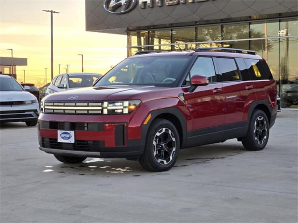 Red 2026 Hyundai Santa Fe SEL 4D Sport Utility SEL FWD 8-Speed Automatic with SHIFTRONIC 2.5L I4 Option Group 01, Tow and Go Package (Tow Hitch and Tow Hitch Ball Mount Kit), 18" x 7.5J Alloy Wheels, 3rd row seats: bench, 4-Wheel Disc Brakes, 6 Speakers, ABS brakes, Air Conditioning, Alloy wheels, AM/FM radio: SiriusXM, Apple CarPlay & Android Auto, Auto High-beam Headlights, Automatic temperature control, Brake assist, Bumpers: body-color, Cargo Blocks, Cargo Net, Cargo Tray, Carpeted Floor Mats, Delay-off headlights, Driver door bin, Driver vanity mirror, Dual front impact airbags, Dual front side impact airbags, Electronic Stability Control, Emergency communication system, Exterior Parking Camera Rear, First Aid Kit, Four wheel independent suspension, Front anti-roll bar, Front Bucket Seats, Front Center Armrest, Front dual zone A/C, Front reading lights, Fully automatic headlights, H-Tex Leatherette Seat Trim, Heated door mirrors, Heated Front Bucket Seats, Heated front seats, Illuminated entry, Knee airbag, Leather steering wheel, Low tire pressure warning, Occupant sensing airbag, Outside temperature display, Overhead airbag, Overhead console, Panic alarm, Passenger door bin, Passenger vanity mirror, Power door mirrors, Power driver seat, Power Liftgate, Power steering, Power windows, Radio: AM/FM/HD Display Audio, Rear anti-roll bar, Rear seat center armrest, Rear side impact airbag, Rear window defroster, Rear window wiper, Remote keyless entry, Security system, Speed control, Speed-sensing steering, Split folding rear seat, Spoiler, Steering wheel mounted audio controls, Tachometer, Telescoping steering wheel, Tilt steering wheel, Traction control, Trip computer, Turn signal indicator mirrors, and Variably intermittent wipers.