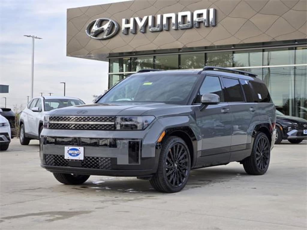 Gray 2026 Hyundai Santa Fe Calligraphy 4D Sport Utility Calligraphy FWD 8-Speed Automatic with SHIFTRONIC 2.5L I4 Option Group 01, 12 Speakers, 3rd row seats: bench, 4-Wheel Disc Brakes, ABS brakes, Air Conditioning, All Season Fitted Liners, Alloy wheels, AM/FM radio: SiriusXM, Apple CarPlay & Android Auto, Auto High-beam Headlights, Auto-dimming Rear-View mirror, Automatic temperature control, Brake assist, Bumpers: body-color, Cargo Net, Carpeted Floor Mats, Delay-off headlights, Driver door bin, Driver vanity mirror, Dual front impact airbags, Dual front side impact airbags, Electronic Stability Control, Emergency communication system, Exterior Parking Camera Rear, First Aid Kit, Four wheel independent suspension, Front anti-roll bar, Front Bucket Seats, Front Center Armrest, Front dual zone A/C, Front reading lights, Fully automatic headlights, Garage door transmitter: HomeLink, Heads-Up Display, Heated & Ventilated Front Bucket Seats, Heated door mirrors, Heated front seats, Heated rear seats, Heated steering wheel, Illuminated entry, Knee airbag, Leather steering wheel, Low tire pressure warning, Memory seat, Navigation System, Occupant sensing airbag, Outside temperature display, Overhead airbag, Overhead console, Panic alarm, Passenger door bin, Passenger vanity mirror, Power door mirrors, Power driver seat, Power Liftgate, Power moonroof, Power passenger seat, Power steering, Power windows, Quilted Premium Nappa Leather Seat Trim, Radio: AM/FM/HD Bose Premium Audio System, Rain sensing wipers, Rear anti-roll bar, Rear side impact airbag, Rear window defroster, Rear window wiper, Remote keyless entry, Roadside Assistance Kit, Security system, Speed control, Speed-sensing steering, Split folding rear seat, Spoiler, Steering wheel mounted audio controls, Tachometer, Telescoping steering wheel, Tilt steering wheel, Traction control, Trip computer, Turn signal indicator mirrors, Variably intermittent wipers, Ventilated front seats, and Wheels: 21" x 8.5J Unique Dark Finish Alloy. Price includes: $1500 - Hyundai HMF Dealer Choice : $1500 discount and 5.39% APR for 24 months. $44.05 per $1000 financed. Available to well qualified buyers who finance through Hyundai Motor Finance. H704. Exp. 02/02/2026