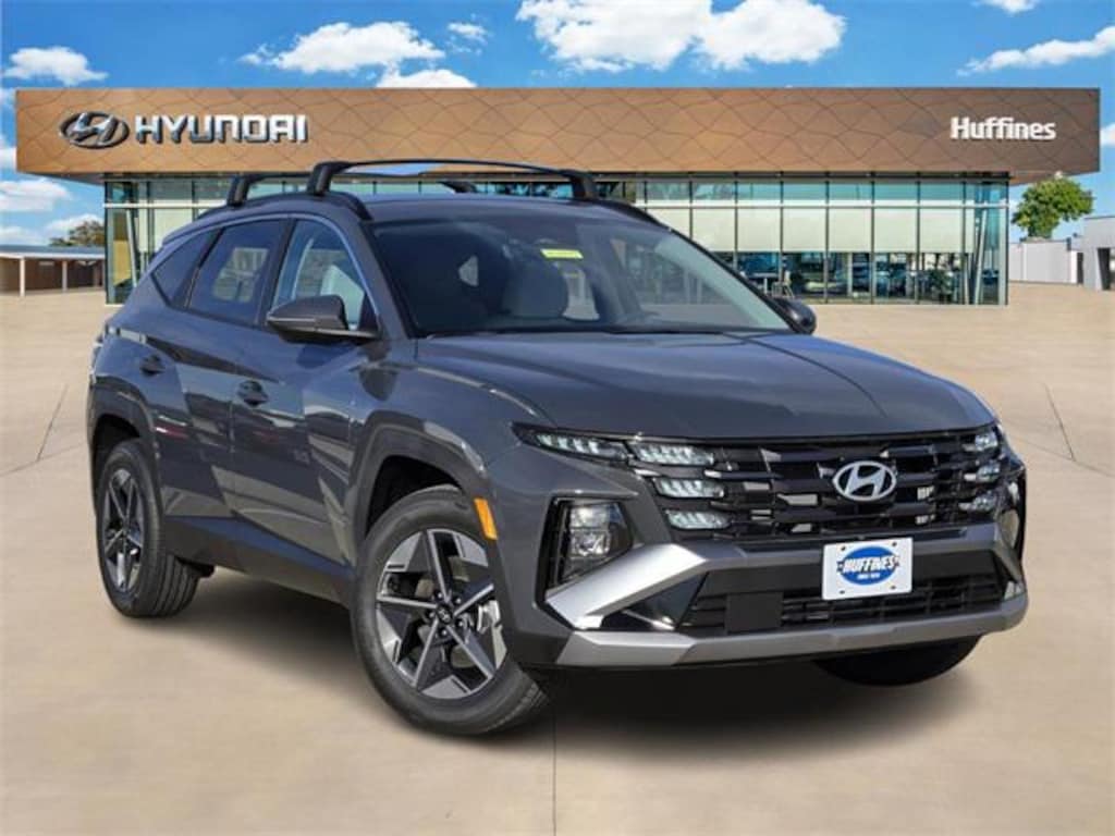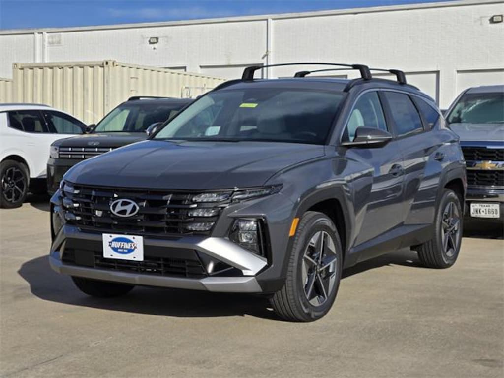 Gray 2026 Hyundai Tucson Hybrid SEL Convenience 4D Sport Utility SEL Convenience AWD 6-Speed Automatic 1.6L I4 DGI Hybrid Turbocharged DOHC 16V LEV3-SULEV30 Option Group 01, 18" x 7.5J Alloy Wheels, 4-Wheel Disc Brakes, 6 Speakers, ABS brakes, Air Conditioning, Alloy wheels, AM/FM radio: SiriusXM, Apple CarPlay & Android Auto, Auto High-beam Headlights, Auto-dimming Rear-View mirror, Automatic temperature control, Brake assist, Bumpers: body-color, Cargo Blocks, Cargo Cover, Cargo Net, Cargo Tray, Carpeted Floor Mats, Delay-off headlights, Driver door bin, Driver vanity mirror, Dual front impact airbags, Dual front side impact airbags, Electronic Stability Control, Emergency communication system: None, First Aid Kit, Four wheel independent suspension, Front anti-roll bar, Front Bucket Seats, Front Center Armrest, Front dual zone A/C, Front reading lights, Fully automatic headlights, H-Tex Trimmed Seat Trim, Heated door mirrors, Heated Front Bucket Seats, Heated front seats, Illuminated entry, Leather steering wheel, Low tire pressure warning, Occupant sensing airbag, Outside temperature display, Overhead airbag, Overhead console, Panic alarm, Passenger door bin, Passenger vanity mirror, Power door mirrors, Power driver seat, Power Liftgate, Power steering, Power windows, Radio data system, Radio: AM/FM/HD Audio System, Rear anti-roll bar, Rear reading lights, Rear seat center armrest, Rear side impact airbag, Rear window defroster, Rear window wiper, Remote keyless entry, Roof Rack Cross Rails, Security system, Speed control, Split folding rear seat, Spoiler, Steering wheel mounted audio controls, Tachometer, Telescoping steering wheel, Tilt steering wheel, Traction control, Trip computer, Turn signal indicator mirrors, and Variably intermittent wipers.
